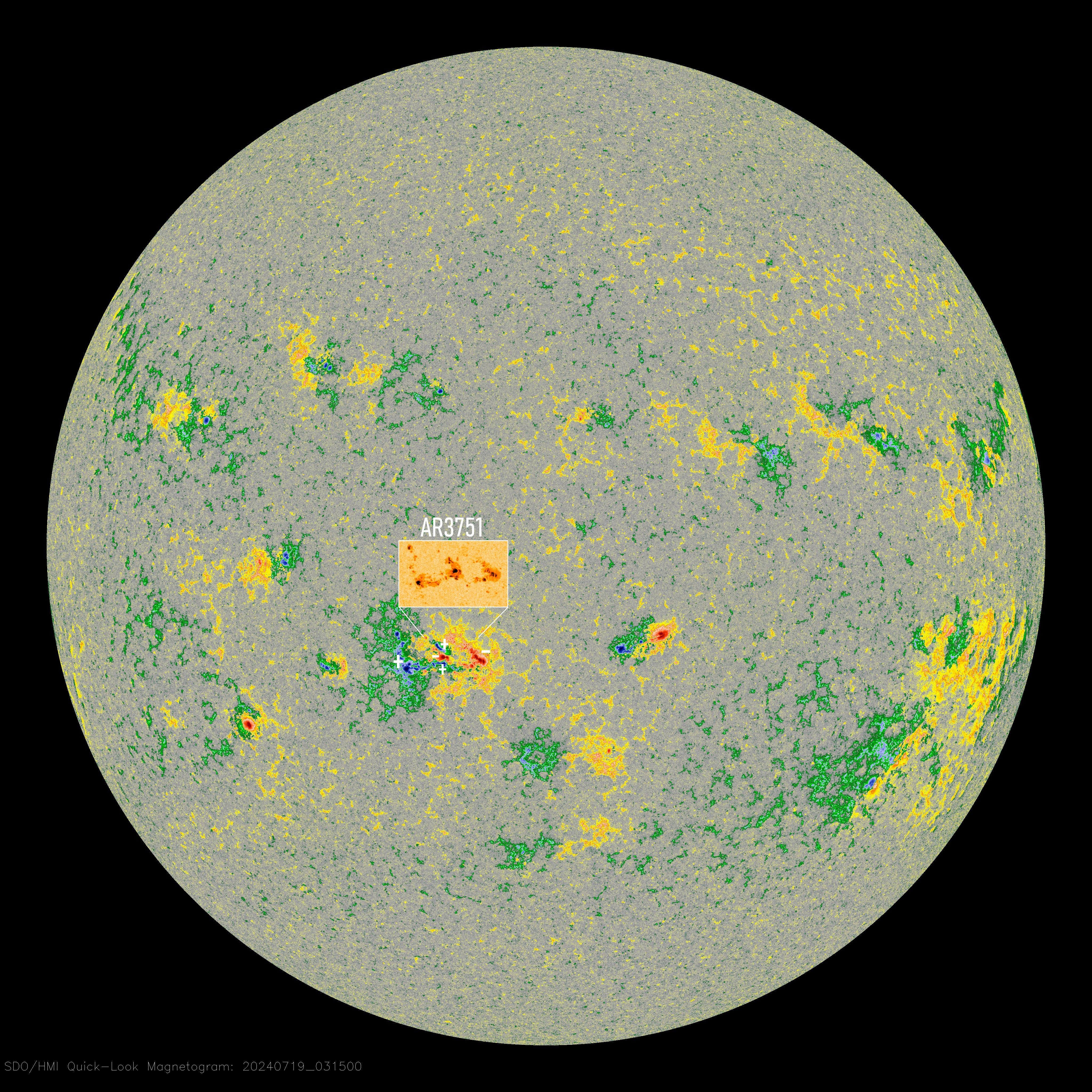 It hasn’t exploded … yet. Growing sunspot AR3751 has a mixed-polarity magnetic field that harbors energy for X-class solar flares. Note the plus-minus-plus sandwich at the heart of the sunspot in this magnetic map from NASA’s Solar Dynamics Observatory: