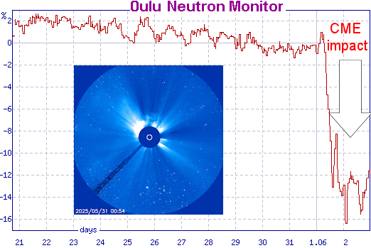On June 1, 2025, a fast-moving CME crossed Earth’s orbit and thinned our planet’s radiation environment. Cosmic ray fluxes dropped as much as 25%. To find another Forbush Decrease this deep, you have to go all the way back to October 30, 2003, when CMEs related to the famous Halloween Storms were pummeling Earth.