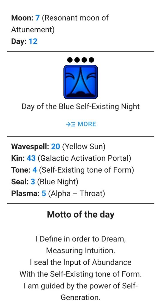 I perfect in order to evolve. Producing synchronicity I seal the matrix of navigation with the planetary tone of manifestation. I am guided by the power of life force.