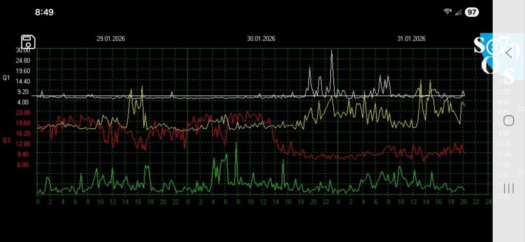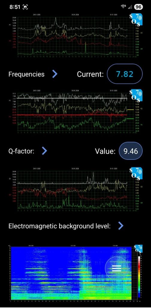 Not much happening in amplitude but Qfactor and frequency are pulsing high alpha/beta hz. The top line frequencies or Tone 8 is 8.72 alpha hz, as high as I’ve ever seen it.