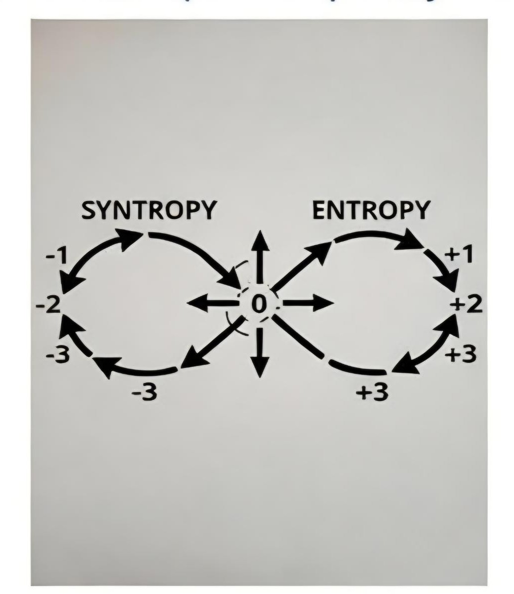 (as detailed in the Harmonic Element Stability blueprint, Fig. 1). This is visualized in the lemniscate diagram (Fig. 2), where syntropic (left loop: -1 to -3, counterclockwise dissipation) and entropic (right loop: +1 to +3, clockwise buildup) energies cross at a zero-point idle, enabling self-regulation without infinite loops.