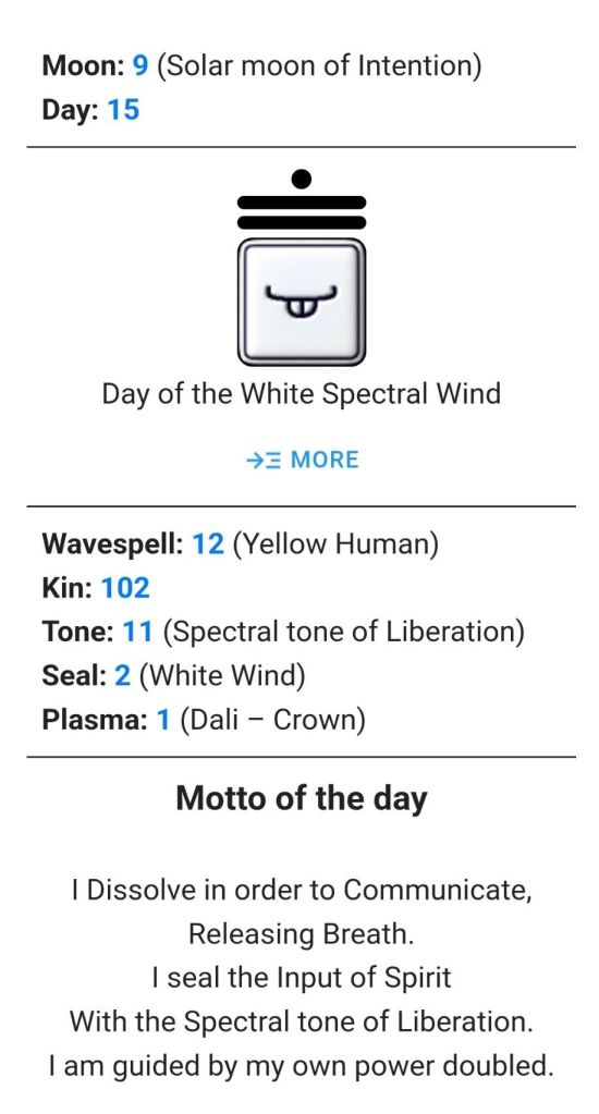 Amazing personal synchronicity on this day. This kin was the day of my Michael’s burial on 7/5/2016. White 11 Wind, today, was my husband Dave’s burial. I always knew their lives and their deaths were linked synchronistically and they were analogs. Dave was White 4 Wizard and Michael was Red 1 Serpent. Different tones but analog tribes. It counts. And they were both extremely autistic and brilliant. I’m tellin’ ya. This Time Harmonic is really something when it comes to relationships. I hope you use an app and dial your people into it.-Lisa T.