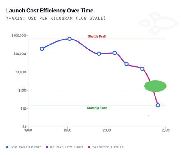 - Launch costs plummet ~4,000× from the old $65,000/kg standard.