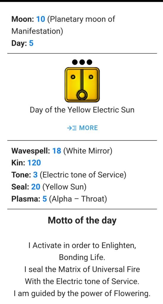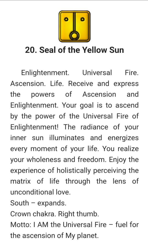 I dissolve in order to enlighten. Releasing life I seal the matrix of universal fire with the spectral tone of liberation. I am guided by my own power doubled. I am a polar kin. I transport the yellow galactic spectrum.