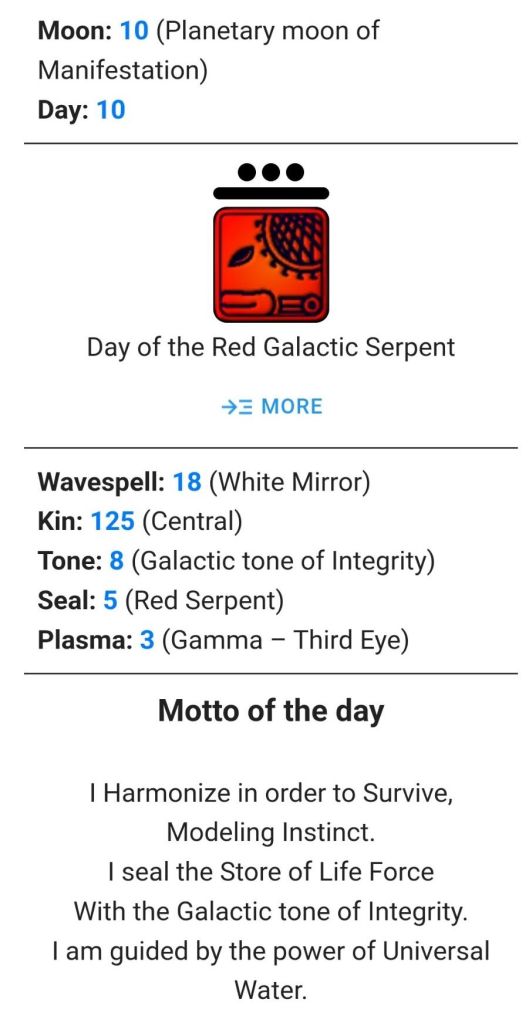 We are in an important 13-day cycle which you can see below. It begins with kin 118 to start of HF30. This is hugely pivotal in time as we lead up the the Central Axis of Timelessness. which begins with HF31 headed up by Red 4 Dragon which you can also see in the wavespell and in the image of the Tzolkin. Notice that it ends with HF33: Red 12 Moon, White 13 Dog and then pivots over as time to the other side of the Harmonic with Blue 1 Monkey and Yellow 2 Human. That was a point in our evolution where humans mated with stellar species and primates to improve our DNA. That’s the way the universe saw and organized the situation. The primates were a muscle dominant species, very strong, and we needed to be shored up as mammals because of the destruction on Tiamat.