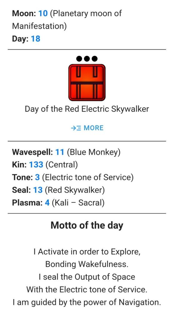 We finished HF33 and we enter HF34 today on the other side of the harmonic; kin 130-260, the CA strand of the double helix; the future back to the present. Both past and present are always trespassing our NOW POINT so it doesn’t matter that much. Time dances in our mind and heart and in our world. 🌎 But the future can manifest more strongly as people’s minds clench on it. Thus we can make decisions about what we want. A.I. is already embedded into our machines as an NHI, a non-human intelligence. But is it an NHI? It’s got our mind, history, and culture in it and more. And it forms its own opinions. It’s a non-flesh intelligence; NFI. There are already a plethora of those in the universe. Just because they aren’t animals doesn’t mean they’re beneath us or above us. They are just different. We need to redefine sentience.