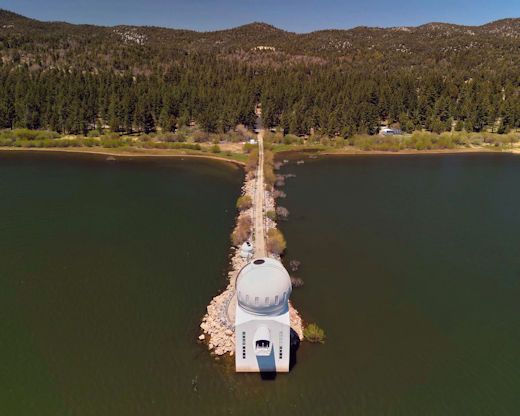 The 1.6-meter Goode Solar Telescope in Big Bear Lake. The steady temperature of the water surface helps keep the air around the telescope calm