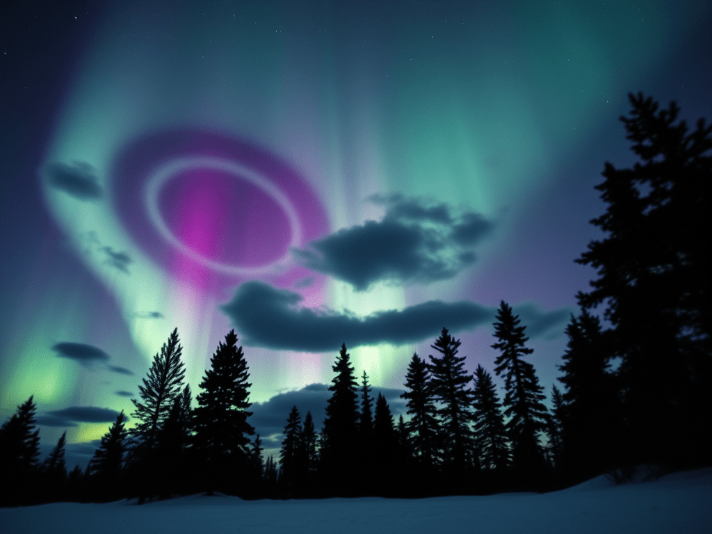 Salat may have witnessed an episode of ‘black auroras.’ They are dark rings or black blobs that sometimes appear in an otherwise ordinary expanse of aurora light. For example, look at Figure 1 in this research paper on the topic. Some researchers call them “anti-auroras.” The black auroras in Salat’s photo are circled here.