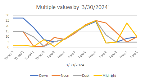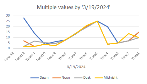 Remember that the TIME are the colored lines. Along the bottom are the Tones or layers and on the left are the hertz levels of sound.