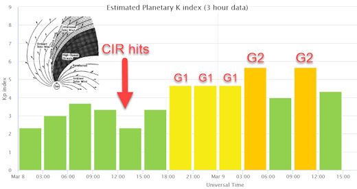 CIR HITS EARTH, SPARKS AURORAS: If you’ve never heard of a co-rotating interaction region (CIR), just think of it as a mini CME. One hit Earth on March 8th, sparking more than 10 hours of geomagnetic storms. “The auroras in Minnesota were some of the brightest I’ve seen in a while,” reports Anna Eastman, who watched the show from the Agassiz Wildlife Refuge: