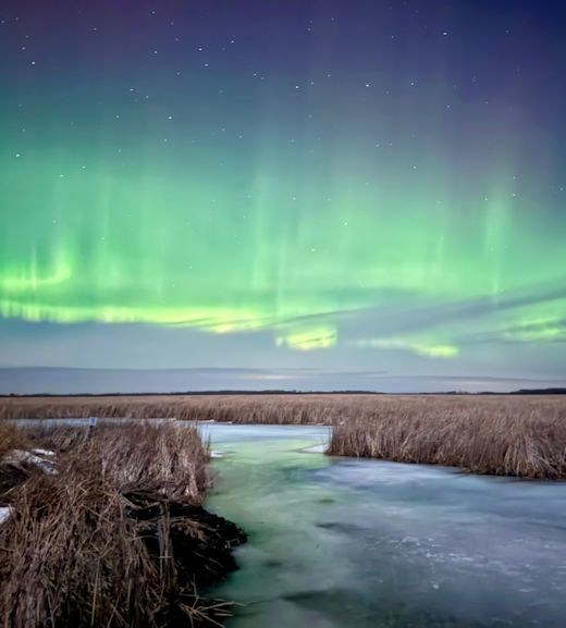 “The event began with intense reds sweeping in from the east and engulfing the sky,” says Dyer, who recorded the display from Grasslands National Park in southwest Saskatchewan. “The greens followed, mixing with the reds to produce a bouquet of yellows and oranges.” It was over in less than 15 minutes.