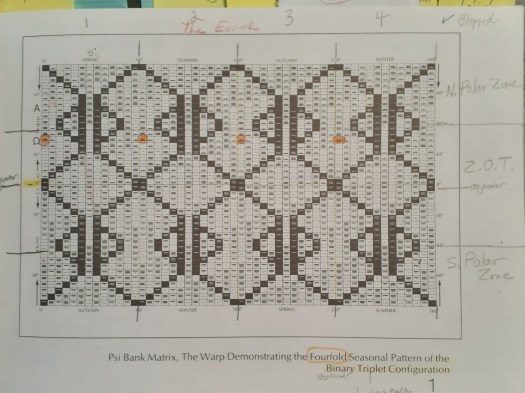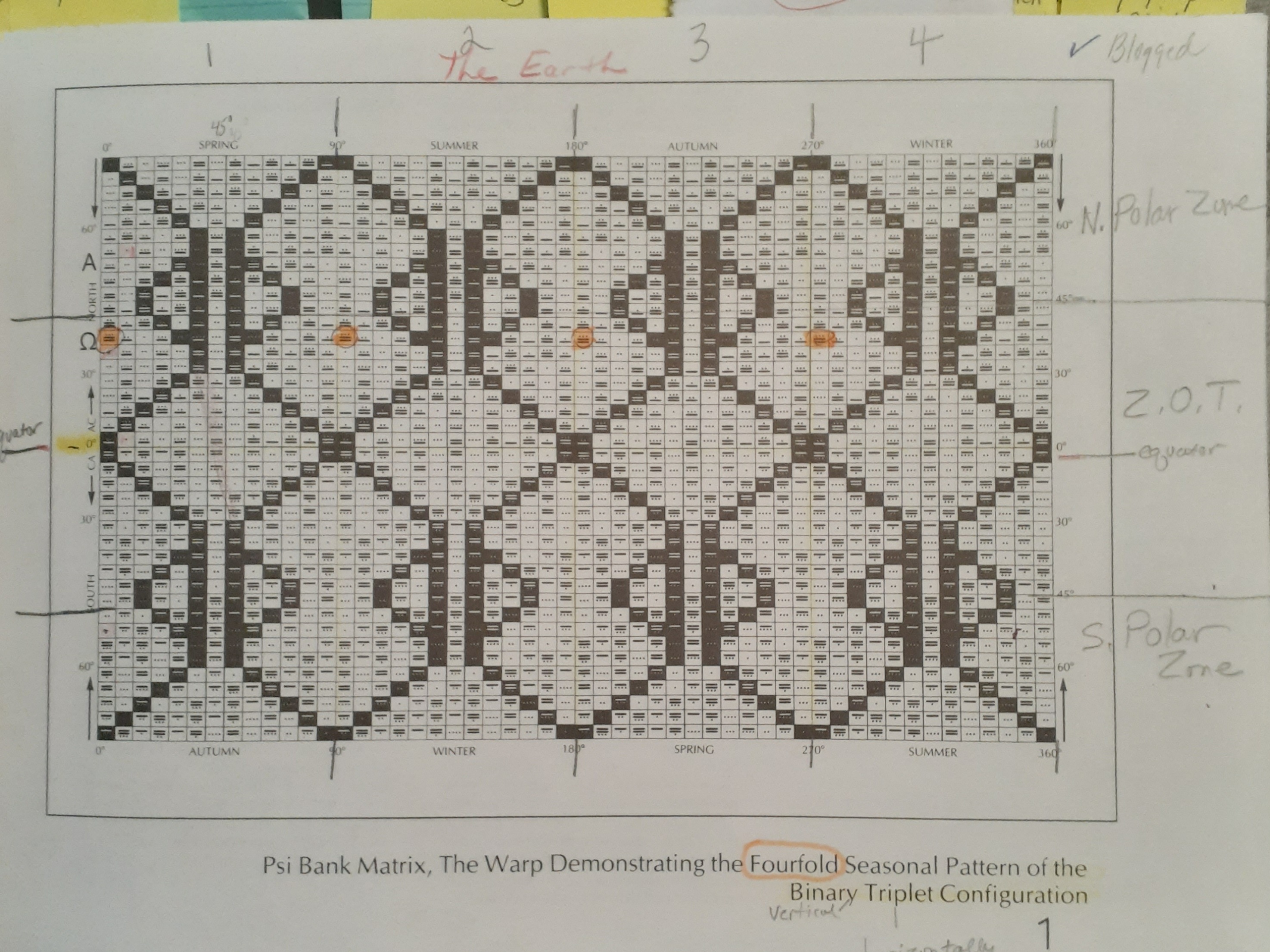 “Encoded in the psi bank warp are four sets of binary triplet configurations set ninety degrees apart conjoined at the zero latitude or equatorial line. The four ninety-degree divisions encompass THE SURFACE OF THE EARTH. The ninety-degree divisions also correspond to the progression of the seasons in their north/south polarity, for a total of eight sets, each defined and characterized by a binary triplet configuration. The primal symmetry and primordial order of the warp pattern of the psi bank matrix distinguish it as the aboriginal generative field from which all other patterns, systems, structures, and orders of being and knowing are derived. The most primary of these structures, of course, is the binary triplet configuration itself.”-Pg. 30 of Earth Ascending