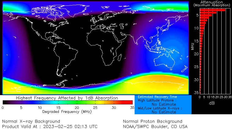 Our planet’s magnetic field is funneling the particles toward the poles, where a second type of radio blackout is underway–a polar cap absorption (PCA) event. Airplanes flying over these regions may find that their shortwave radios won’t work due to the ionizing effect of infalling protons: map.
