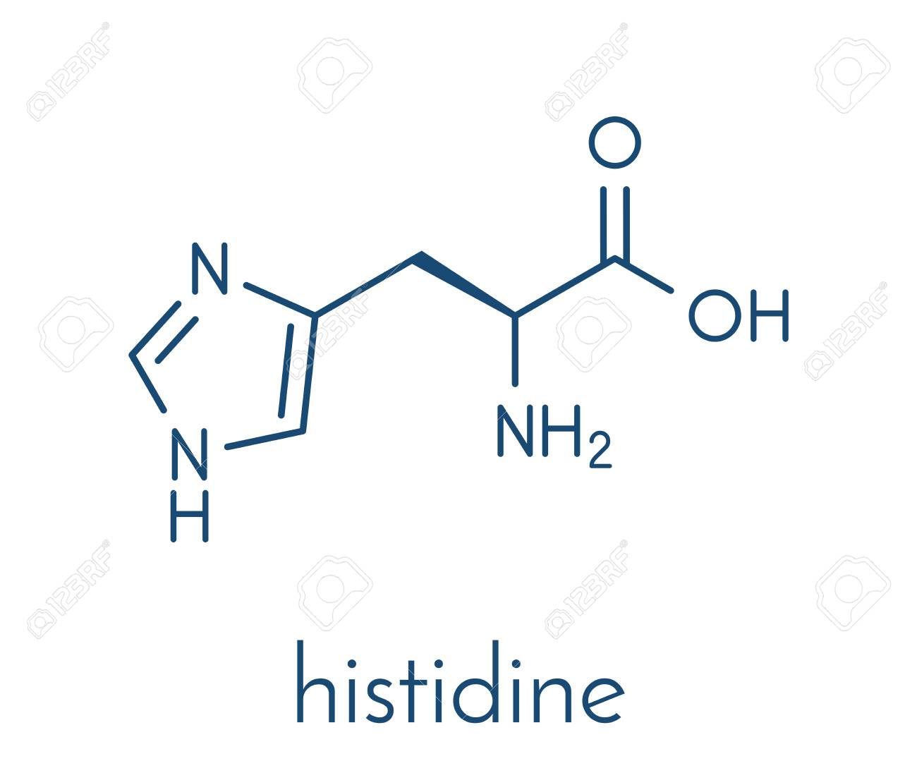 Histidine (l-histidine, his, H) amino acid molecule. Skeletal fo