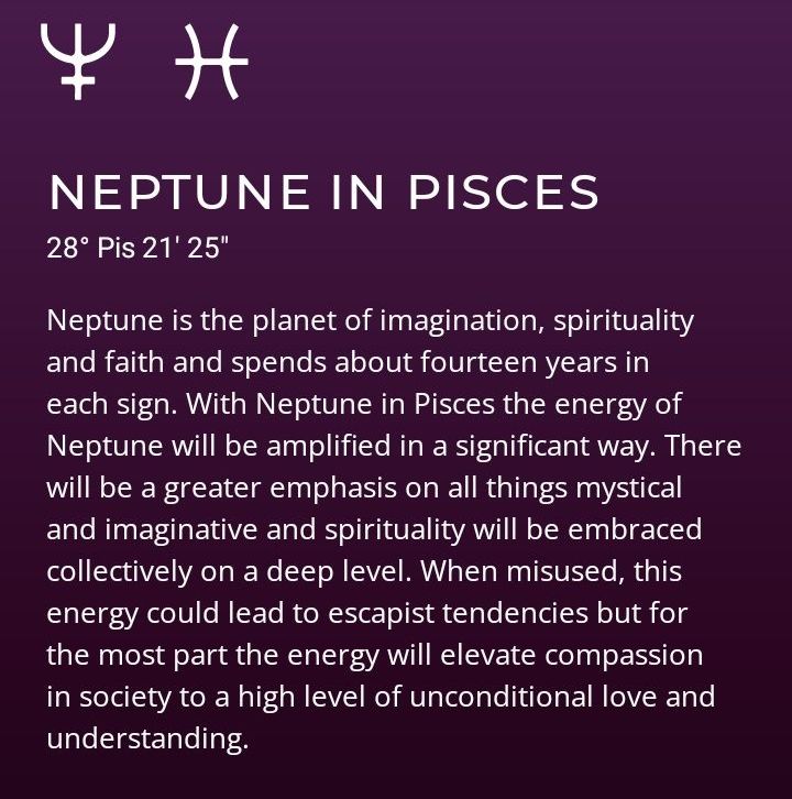 - As it harmonizes with spiritual Neptune in Pisces, we’re more likely to factor in our spiritual values and need for imagination, romance, and concern or compassion for others into our pursuit. We’re finding the best in people and our relationships or pleasures today. We approach one another more gently and sensitively than usual and embrace loving, non-possessive feelings. Ideally, this is a time for decompressing, winding down, and tapping into our intuition. We might put our faith into a cause, loved ones, or a pet project.