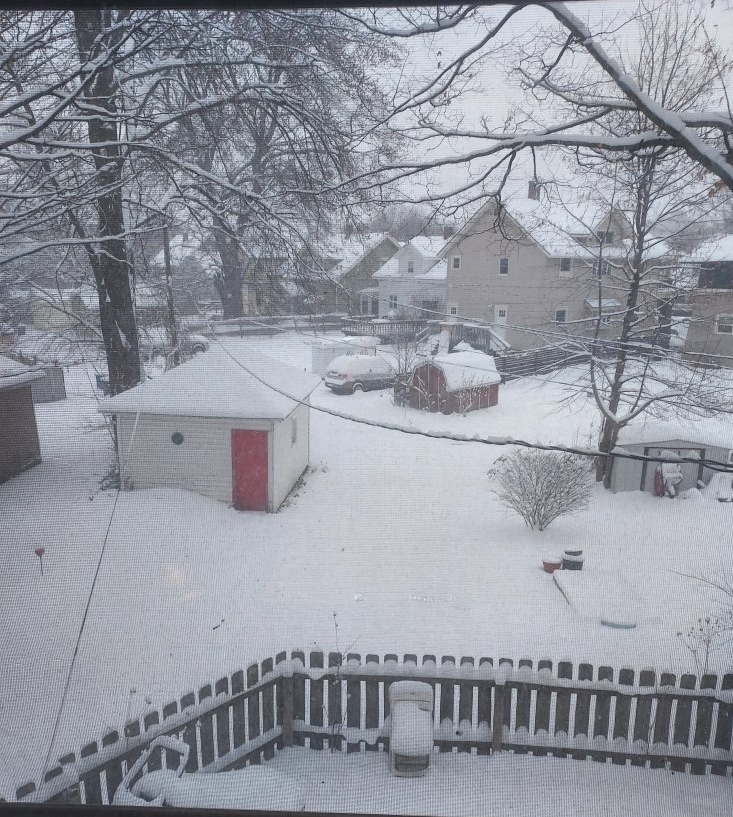 This is the view out of my office window as I post today. We got 6 inches of lake effect snow in Michigan. We love ❤️ it. The houses in my neighborhood and mine are all 100 years old or more. My locksmith who was here yesterday lives in a house built in 1896. These are sturdy houses. My little garage you see there is 100 years old and is very cool inside. The green circle you see on the front of it is the Mayan Round.