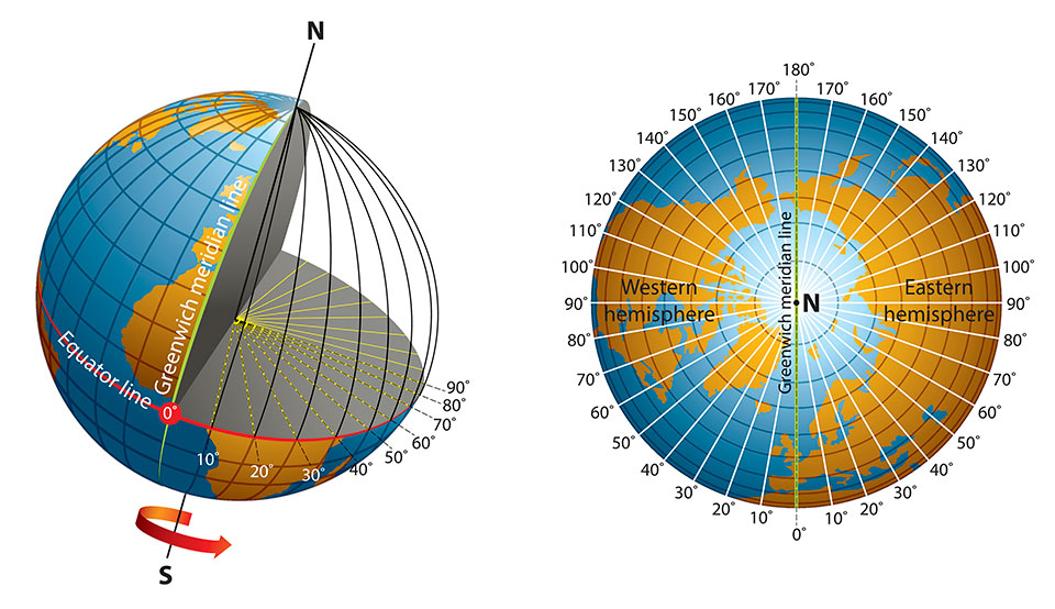 Remember this? Latitude is West to East and Longitude is North to SouthLongitude, looking from the top of the earth, the vertical lines going down at angles around the earth.