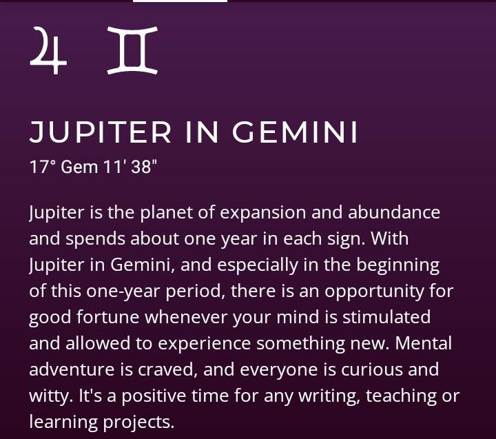 - Note that Jupiter spends its retrograde entirely in the sign of Gemini which is ruled by Mercury. Today, there can be a focus on sharing beliefs, morals, and values or on growing and improving through one another. (With regard to my prediction about Trump, he is Tone 3 and his Sun is in Gemini.)