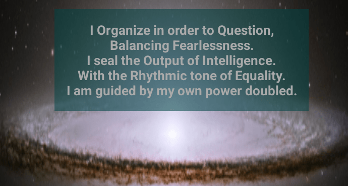 I organize in order to evolve. Balancing synchronicity I seal the matrix of navigation with the rhythmic tone of equality. I am guided by my own power doubled.