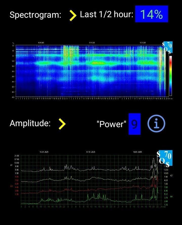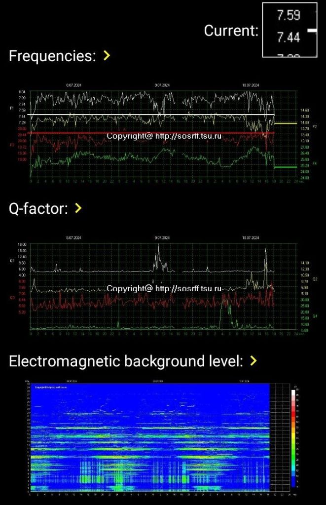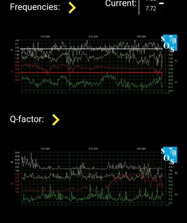 I am looking at layers A3, pulse F3, and pulse Q3 of the SchumannResonance. Allplitudes rose from dawn to dusk. A1 was 14 at dusk. The frequency layer was again uniform next to the earth.