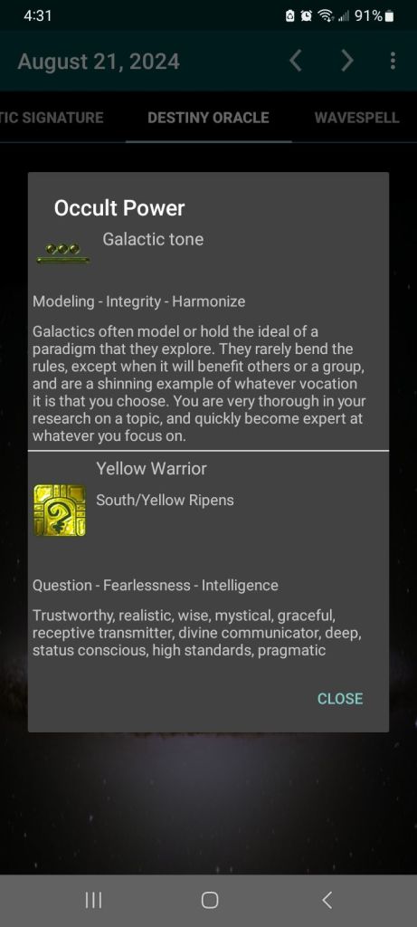 Yellow 8 Warrior tonight is our OCCULT Wisdom mediated by Saturn. Huge synchronicity. Galactic Warrior is about the integrity of the mind, courage, true ideal, and keeping your commitments with love.
