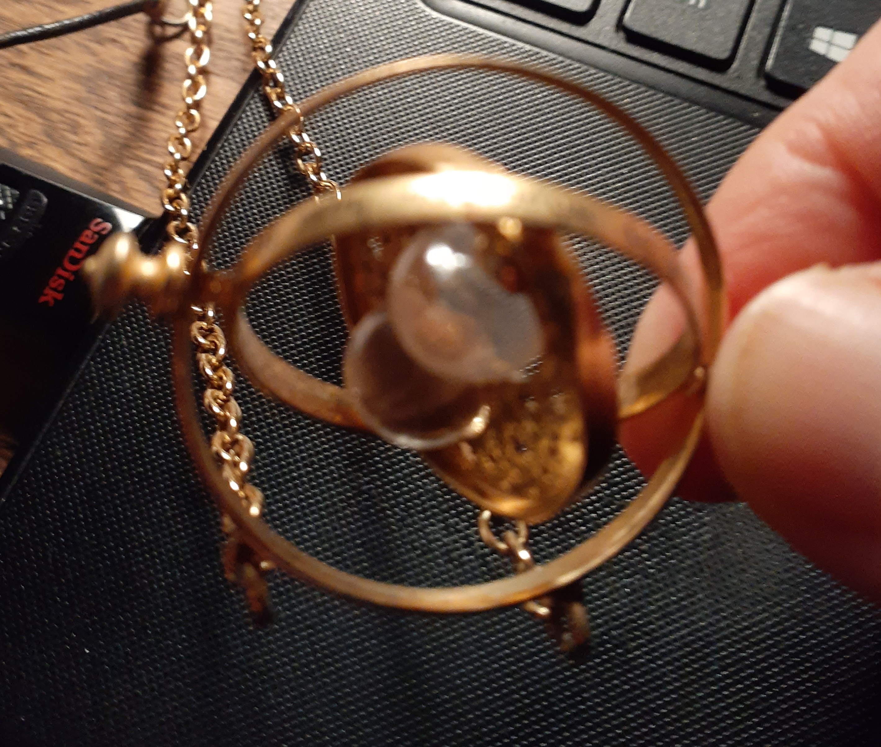 This the time turner necklace my sister gave me for Christmas. A time turner is a mini version of the looking glass.