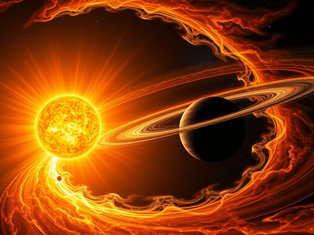 57:5.5 (656.1) As Angona more closely approached the sun, at moments of maximum expansion during solar pulsations, streams of gaseous material were shot out into space as gigantic solar tongues. At first these flaming gas tongues would invariably fall back into the sun, but as Angona drew nearer and nearer, the gravity pull of the gigantic visitor became so great that these tongues of gas would break off at certain points, the roots falling back into the sun while the outer sections would become detached to form independent bodies of matter, solar meteorites, which immediately started to revolve about the sun in elliptical orbits of their own.
