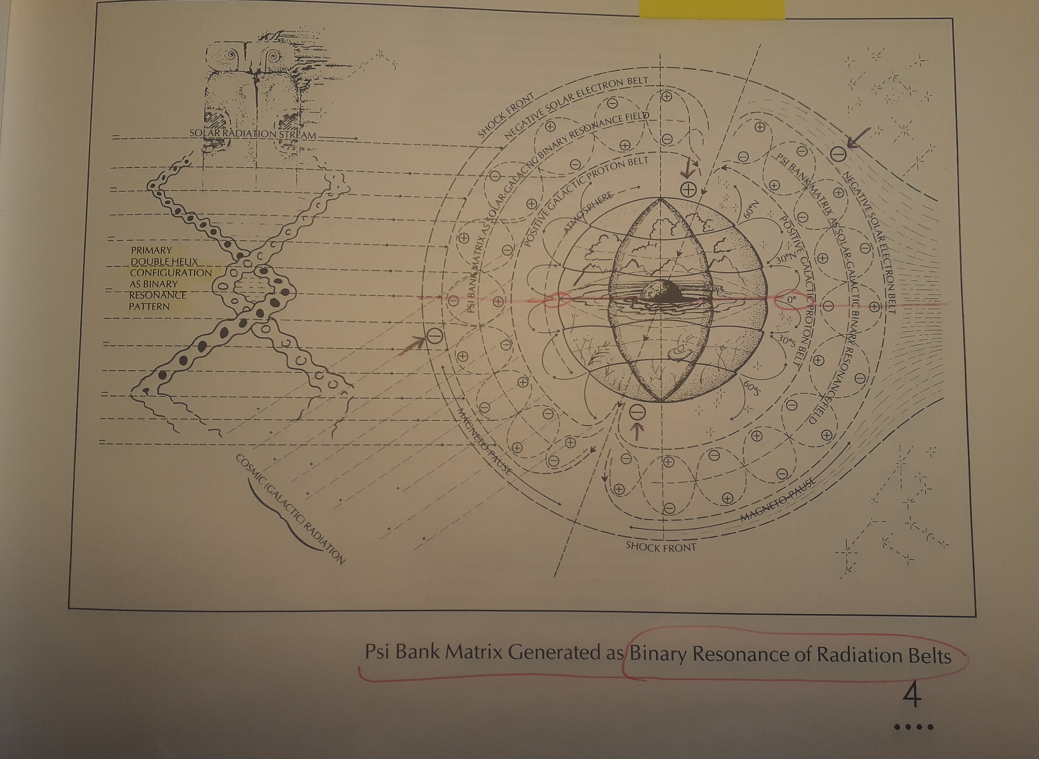“The inner belt consists of trapped positive cosmic radiation and protons. The outer belt holds trapped negative solar radiation and electrons. Together, they provide the binary field for the rudimentary psi bank matrix. The positive/negative polarities of both radiation and psi belts are sensitized to the north/south poles of the geomagnetic (gravitational) field. The psi bank matrix has a simple helical structure. This structure serves as the bio psychic resonance field of planet earth. It is obviously attuned to the primary double helix configuration. This configuration governs the operation of the genetic code. This situation is natural. The spectrum of the bio psychic resonance fields ranges from the simplest cellular organism to the most refined levels of mental activity.”-Earth ascending pg. 36